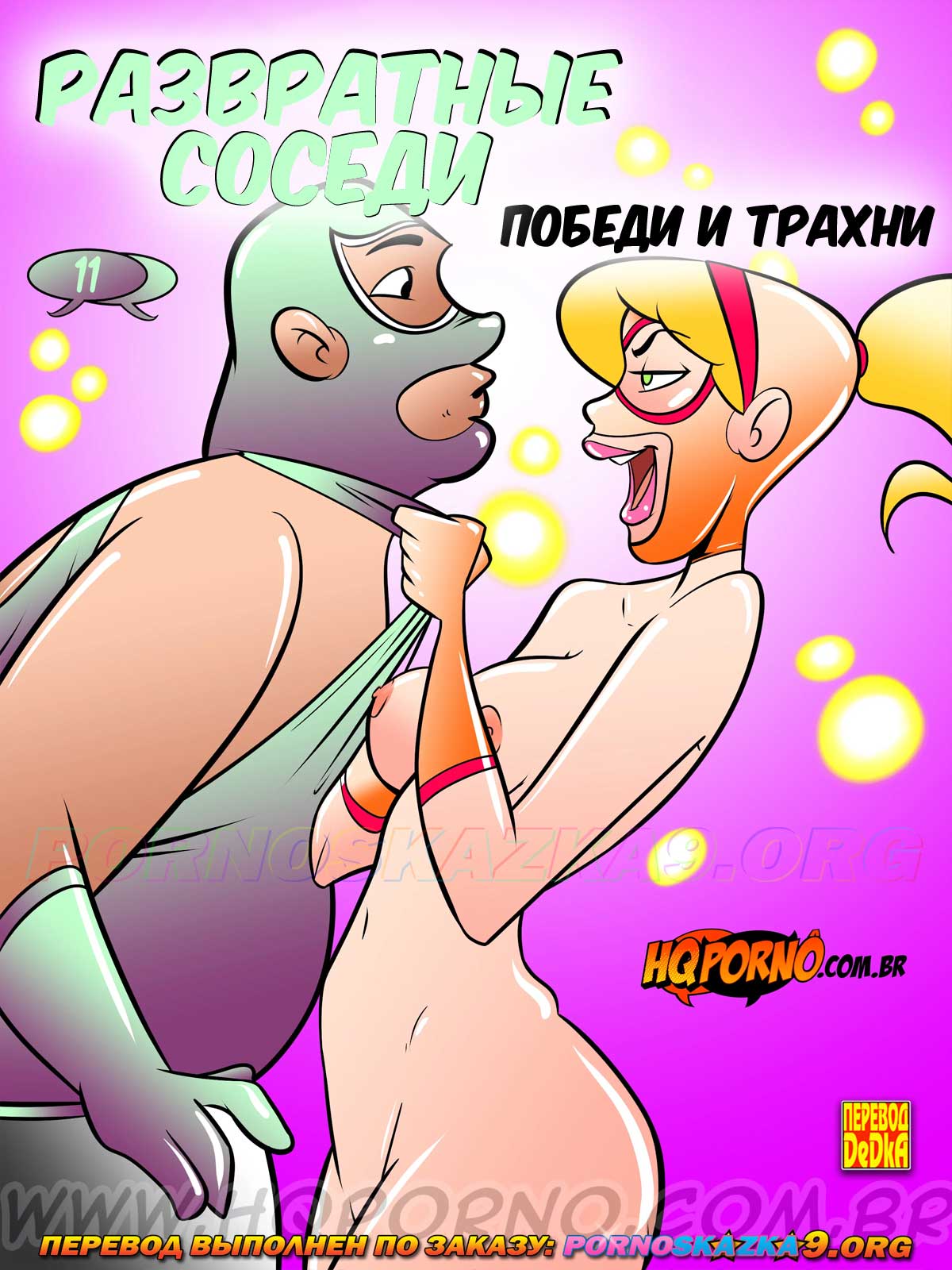 Порно комикс «Развратные соседи. Часть 11. Победи и трахни.» Переключая каналы телевидения, Гордо находит шоу о борьбе между мужчиной и женщиной, где, если парень побеждает, он может трахнуть женщину. Он звонит, и ему удается принять участие в шоу, где он и побеждает, но когда, перед тем, как трахнуть соперницу, Гордо срывает с нее маску, его ждет большой сюрприз…